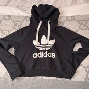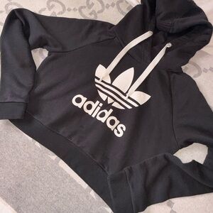 Cropped black Adidas hoodie with bold white logo. Comfortable and stylish.