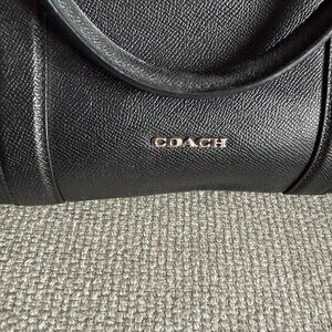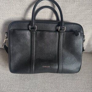 Coach pebble leather briefcase in black. Structured silhouette with top handles and detachable shoulder strap. Timeless professional bag in durable pebbled leather.