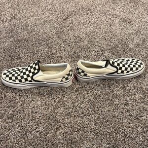 Stylish Vans slip-on sneakers for kids. Features a classic black and cream checkered design. Easy to wear and perfect for any occasion.