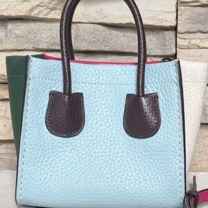 Authentic Coach Cashin Carry mini bag crafted in glovetanned pebble leather with a beautiful colorblock design. This is a mini-sized bag—perfect for essentials such as phone, small wallet, keys, and lip balm. Can be worn as a top-handle or crossbody with the detachable strap. Great statement piece for everyday or casual wear.