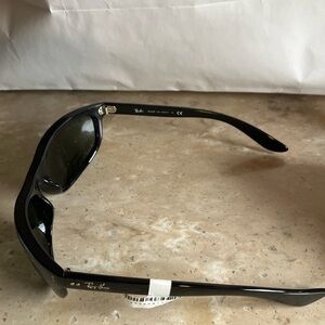 Stylish black Ray-Ban sunglasses with a sleek design. Comes with a matching case and cleaning cloth. **CASE DOES NOT CLOSE TIGHT WITH GLASSES INSIDE BUT GLASSES AND CASE ARE BRAND NEW **