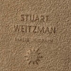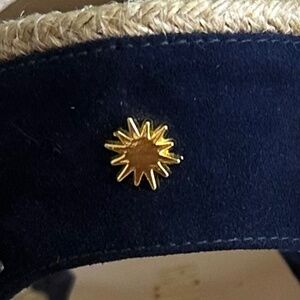 Stuart Weitzman Mirela II Espadrille Wedge Sandal - Navy Blue Suede/Natural - Size 7.5C - Casual. Complete your look with the earthy yet sophisticated style of this distinctive espadrille wedge sandal by Stuart Weitzman. Features an open round toe design, gold tone adjustable buckle closure, braided jute detail on sole and heel strap, suede uppers, leather lining, brand name embossed on footbed, and 3" wedge heel. Made in Spain. Excellent pre-owned condition!