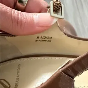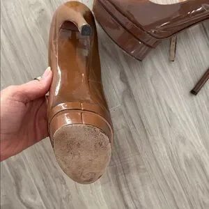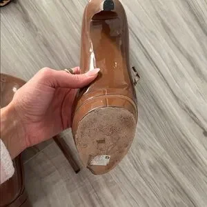 Patent leather platform heels, size 39/8.5. I’m a true 8.5 but feel these were too small. Comes with box and dust bag with 2 additional heel caps. Minor scuff on the right shoe (pictured) and leather backing on straps coming off (can be fixed with leather glue)