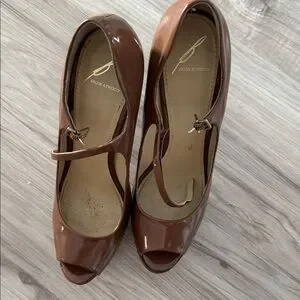 Brian Atwood Patent Leather Brown Peep Toe Heels
