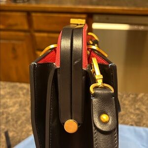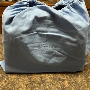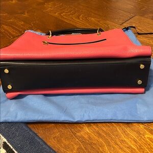 Smythson of Bond Street Pink & Navy Leather Metal Clasp Satchel. Approximate measurements L 14” x H 10” x W 5.5”. Has magnetic closure on top. Two pockets with magnetic closures on each side on the outside. One zip pocket in the outside. Two slide in pockets on the inside along with one zip pocket on opposite side. Fully lined interior and exterior pockets. Has additional strap that attaches on either end of bag. Strap measures approximately 37” so can be carried as shoulder bag. Bag has not been used but does have one slight mark as noted in picture. Includes dust cover bag.