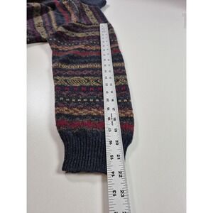 Color: Heathered navy blue base with multicolor Fair Isle pattern in red, gold, olive, and purple tones.