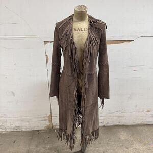 Stunning and dramatic vintage longline coat by Blanco, crafted from 100% genuine suede leather. This statement piece features heavy fringe detailing along the neckline, sleeves, and hem, paired with intricate whipstitch accents throughout. Designed with a slim, open-front silhouette and a smooth bronze-toned interior lining. Perfect for achieving a high-end bohemian, Western-chic, or 70s rockstar aesthetic.