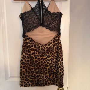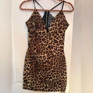Elegant animal print dress with black lace accents. Perfect for a night out.