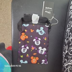 Colorful Mickey Mouse crossbody bag by Loungefly. Features vibrant Mickey designs on a black background. Long strap. Comes from smoke and pet friendly home.