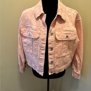 Stylish pink snake print jean jacket. Features button front and chest pockets. Ideal for a trendy look.