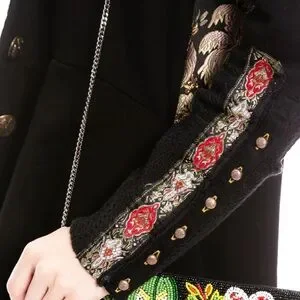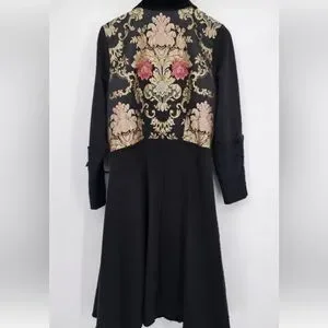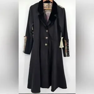 French terry button-down coat, velvet collar/lapel, floral jacquard upper back, jacquard trim sweater knit cuffs, 2 side pockets