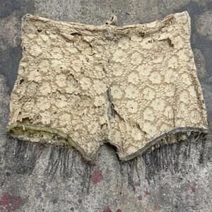 Exquisite and rare museum-quality antique tap shorts, likely dating to the 1920s. These delicate shorts feature a stretchy floral lace body in a faded champagne/nude tone, finished with a dramatic gunmetal-toned beaded fringe along the hem. A true piece of history, these were potentially used for stage performances. While fragile, they remain wearable for photoshoots or as a specialized collector's piece.