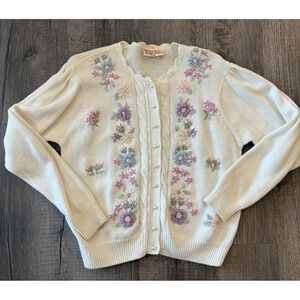 Vtg Huntington Ridge Embroidered Women's White Cardigan Floral Sweater Medium