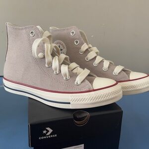 Stylish taupe high tops with classic Converse logo. Durable and trendy design.