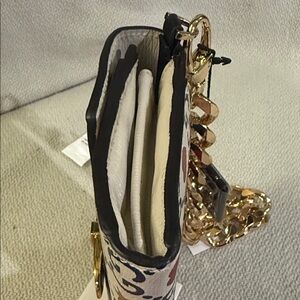 Elegant limited edition Valentine’s Day Gucci wallet with after market chain with heart and star motifs. Features a striking gold chain and signature logo pattern. The wallet is in very good condition with original paperwork. Protective cards are still in card slots. While in great condition, leather shows slight signs of use such as minor loss of shape. Hardware shows signs of minor scratches and possibly small pits. Slight scratch on exterior leather bottom. Overall in very good condition and certainly an eye catcher. Includes COA.