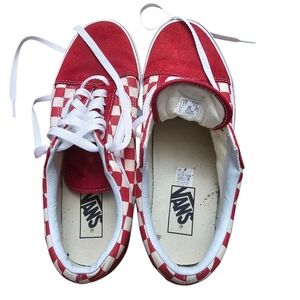 Stylish Vans athletic shoes. Red and white checkered design. Perfect for skateboarding.