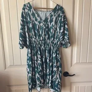 Stylish dress with a Green and tan abstract pattern. Features a V-neck and cinched elastic waist.