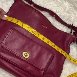 Stylish Coach shoulder bag in deep red/burgundy/wine/maroon/merlot leather. Features brass hardware, a front pocket with a turn-lock clasp, light colored cotton lining with two interior slip pockets and a zipper pocket. Very lightly used, clean inside and out, in excellent preowned condition.