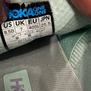 Hoka sneakers in pastel mint and lavender. Ideal for running and casual wear.