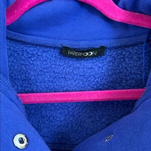 Cozy blue fleece cropped sweatshirt. Features a high collar and snap buttons. Perfect for casual wear.