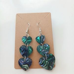 Charming heart earrings with silver hooks. Features blue and green tones. Perfect for any occasion.