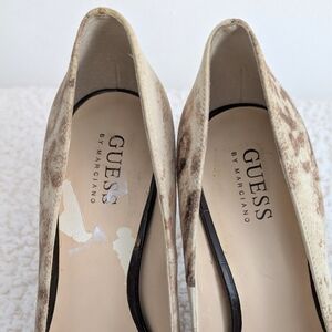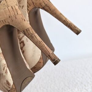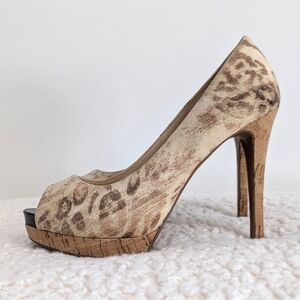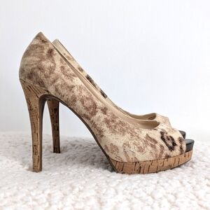 Elevate your look with these stunning Guess by Marciano peep toe heels. Featuring a chic neutral animal print fabric upper with cork platform and heel for added height and style. Classic peep toe design with a sleek silhouette—perfect for nights out, events, or dressing up denim.