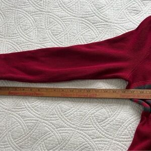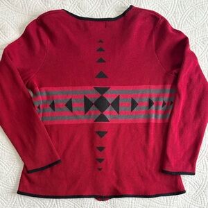 Chic Woolrich cardigan with bold geometric patterns. Features a vibrant red base with black accents. Perfect for layering.