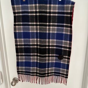 Elegant scarf with red and black plaid pattern. Features fringe detailing.