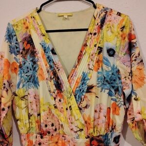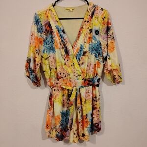 Gianni Bini Floral Pleated V Neck Romper. Size Small, good used condition. Quarter sleeve, waist tie