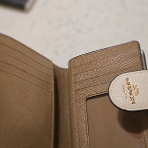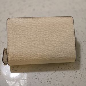Like new Coach wallet. Size 5 in L, 3.5 in H, .5 in W. Chic Coach wallet in ivory. Features textured design. Ideal for essentials.