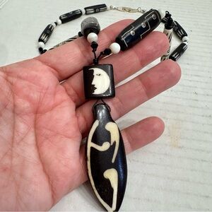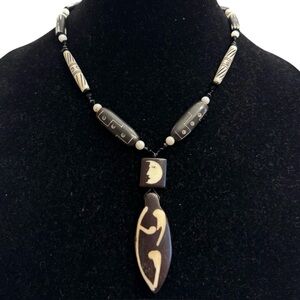 Stunning tribal necklace in brown and crem color hand carved beads. The beads are strung on a leather cord with a silver tone fold over clasp. The necklace measures approximately 20" long with an additional 3" drop for the pendant