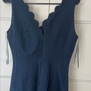 Elegant navy dress with scalloped neckline. Ideal for versatile styling.