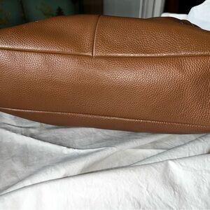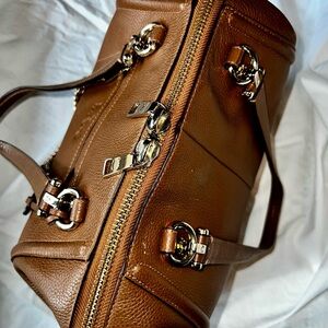 Chic Coach satchel in rich tan leather. Features stylish gold chain details, top handles, and a detachable crossbody strap. Minor wear on bottom corners (see photos)
