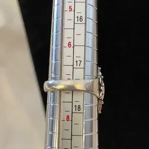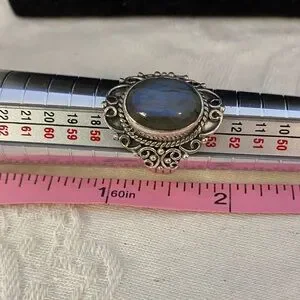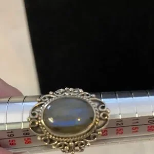 Beautiful Labradorite gemstone ring in 925 SS ring. Size 7 … it’s the perfect, delicate size. Intricate design adds elegance. Normal wear as expected from a much loved ring.