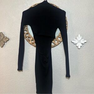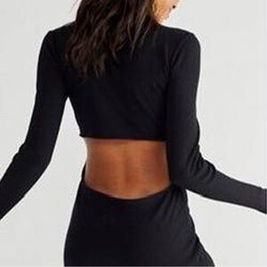 This elegant black dress features a stunning open-back design, perfect for any occasion. Its sleek silhouette offers a sophisticated look.