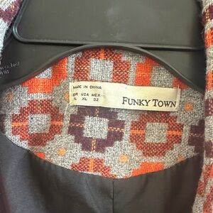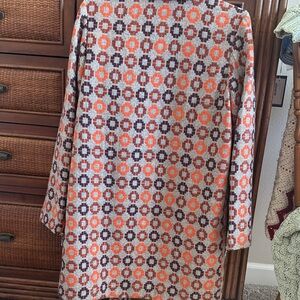 Stylish coat with a vibrant geometric pattern. Features shades of orange, brown, and cream. Perfect for adding a pop of color to your outfit.