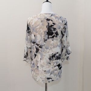 Calvin Klein Career Floral Blouse V Neckline 3/4 Bell Sleeve Ivory, Balck, & White Size S