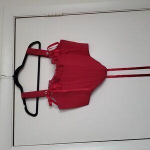 Stylish red corset top featuring elegant ribbon details and lace trim. Perfect for a chic, classic and bold look.