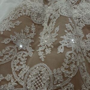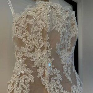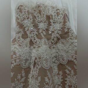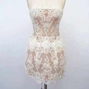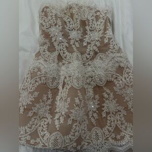 Elegant strapless dress with intricate lace detailing. Perfect for special occasions.