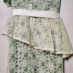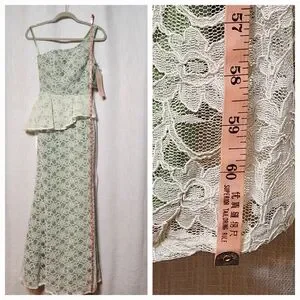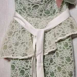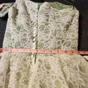 Please review all photos. This dress is beautiful. No flaws were found. Please ask any questions prior to purchase.