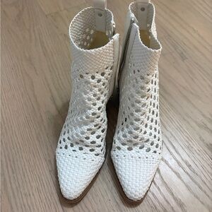 Elegant white booties with a unique woven design. Features a sturdy block heel. Ideal for stylish outings.