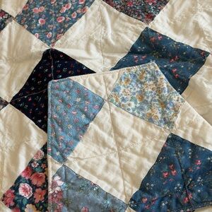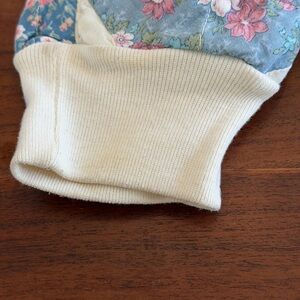Stylish patchwork quilted jacket with a mix of floral and geometric patterns. Features a double zip-up front and a cozy design. Perfect for adding a unique touch to your outfit.