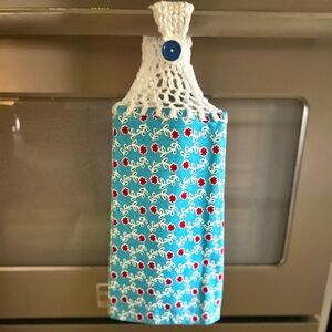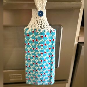 Colorful floral handmade blue crocheted top hanging kitchen or bathroom hand towel lovingly made by me