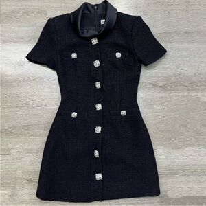 Prep, polish and legs for days: this mini dress is cut from black bouclé for its rich texture. A high satin collar and oversized sparkling buttons add elegant accents that go from desk to dinner.