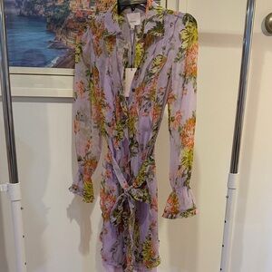 Chic lavender dress with vibrant floral patterns. Features long sleeves and a tie waist. Ideal for stylish outings.
