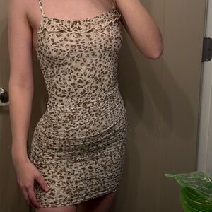 Stylish leopard print mini dress. Features spaghetti straps and ruffle detail. Perfect for a night out.