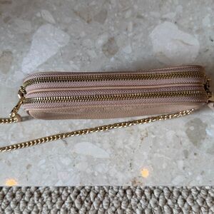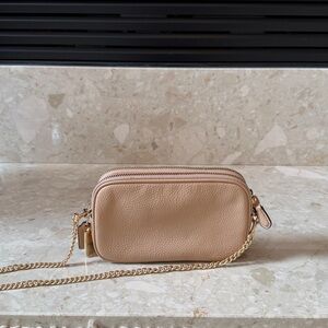 Chic Coach crossbody bag in a soft tan beige Features a sleek design with a gold chain strap.