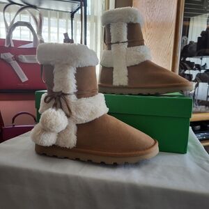 J.CREW Faux-fur Booties In Suede With Pom-Poms In Biscotti Brown Size 7
