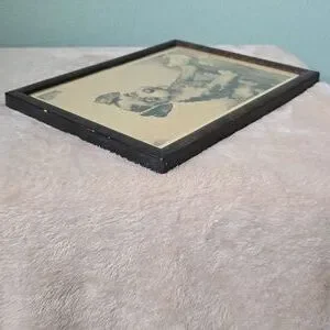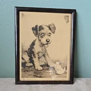 Charming vintage art print featuring a playful dog with a just hatched spring chick in a classic brown wood frame. Perfect for adding a touch of nostalgia to your home decor.