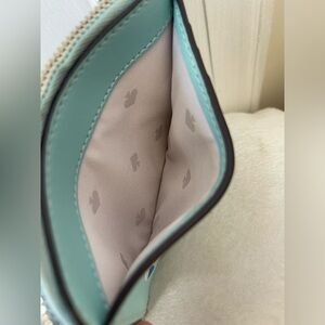Chic aqua wallet adorned with swimmer graphics. Features a silver chain accent.minimal signs of use.